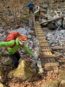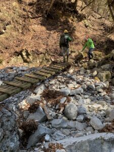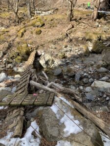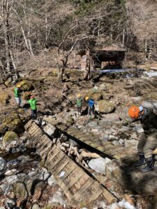場所は、大滝橋から畦ヶ丸の登山道の途中で一軒家避難小屋の前の木橋をかけ直してきました。