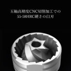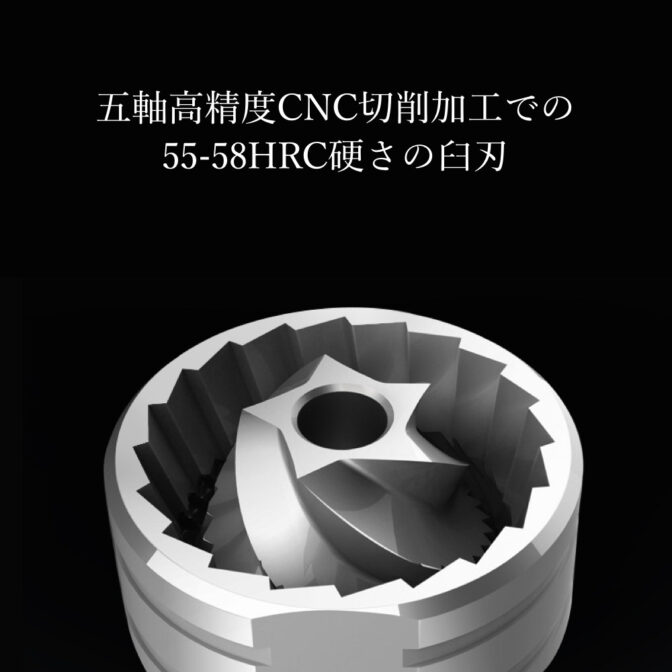 五軸高精度CNC切削加工での55-58HRC硬さの臼刃は均一な挽目の保証です。微粉の発生も最小限に抑えられます。ハイクオリティな挽目が、コーヒー豆の特徴をバランス良く、そして余すことなく抽出できます。